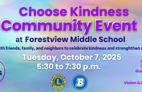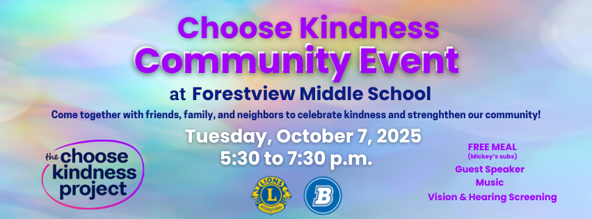 Forestview Middle School, in partnership with Lions Club, invites the public to a FREE Choose Kindness Community Event. This family-friendly gathering will feature a free meal, music, hands-on kindness projects, activities, and valuable community resources. Vision and hearing screenings will also be available on-site.